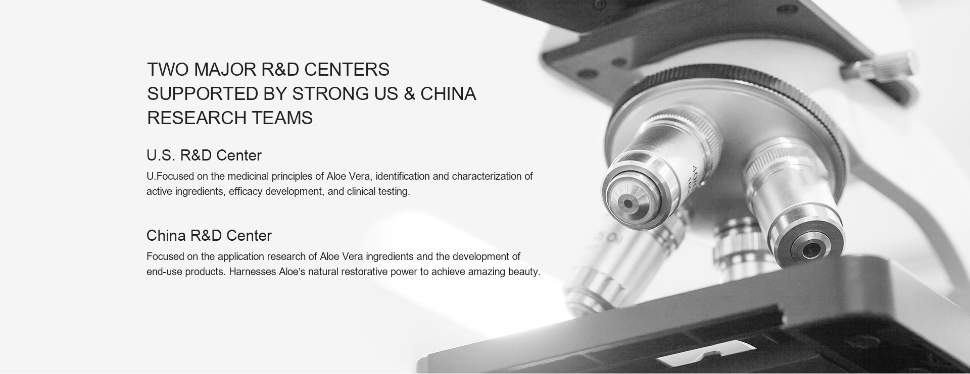 Focused on in-depth study of natural active compounds in Aloe, including identification of active nutrients, extraction and purification technologies, and efficacy evaluation of nutritional components. Based on these extracted active ingredients, scientific research is conducted in personal care, food, and pharmaceutical fields, with a focus on developing Aloe end-use products with specialized functions. The goal is to use products as a medium to allow consumers to truly experience the remarkable benefits of Aloe’s natural properties.